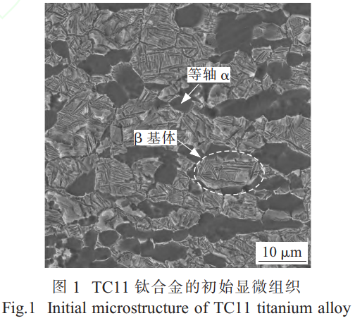 實(shí)驗(yàn)選用符合 GB/T2965 標(biāo)準(zhǔn)的 TC11鈦合金鍛造棒料(直徑準(zhǔn) 25mm,供貨態(tài)為 α+β鍛造組織),其相變點(diǎn)范圍為 1010~1015℃。TC11合金的化學(xué)成分見表 1。從初始鍛態(tài)材料中切取尺寸為 3mm×3mm×2mm 的試樣。該合金的初始顯微組織如圖 1 所示,呈現(xiàn)標(biāo)準(zhǔn)的雙態(tài)組織,其中灰暗色部分為 α 相,白亮色部分為 β 相。