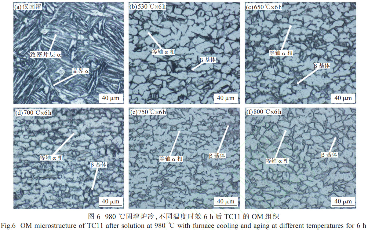 圖 6、7 分別為 TC11鈦合金經(jīng) 980℃固溶 1h 后爐冷,隨后在 530~800℃時(shí)效 6h 后的 OM 和 SEM 顯微組織。圖 6(a)、圖 7(a)為固溶態(tài)未時(shí)效組織,隨著時(shí)效溫度從 530℃提升至 800℃,初生 α 相的含量和晶粒大小未發(fā)生顯著變化,如圖 6(b)~(f)、圖 7(b)~(f)所示。定量分析組織中等軸 α 相的體積分?jǐn)?shù),其穩(wěn)定在 80% 左右,幾乎沒有發(fā)生改變。這表明在 530~800℃的時(shí)效溫度范圍內(nèi),時(shí)效溫度對(duì)初生 α 相的影響較小。初生 α 相的形態(tài)和體積分?jǐn)?shù)主要由固溶處理工藝所決定。