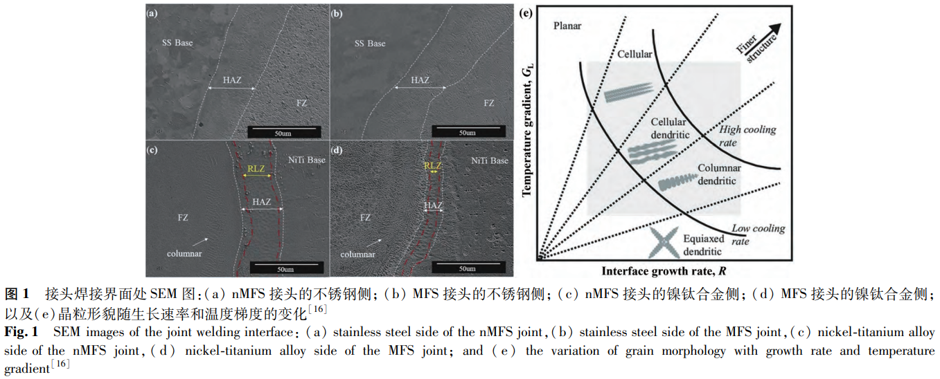 Farhang等使用激光焊連接鎳鈦合金與不銹鋼,探究了外磁場(chǎng)對(duì)焊接接頭的影響。其中,無(wú)外磁場(chǎng)輔助的焊接記為nMFS,外磁場(chǎng)輔助的焊接記為MFS兩種接頭焊縫界面處的SEM圖如圖1所示。從圖1中可以觀察到,在這兩種接頭中均出現(xiàn)從熔合區(qū)中心向熱影響區(qū)的晶體形態(tài)轉(zhuǎn)變的現(xiàn)象。在nMFS接頭中,從熔合區(qū)中心至不銹鋼側(cè),晶體形態(tài)呈現(xiàn)出由等軸晶粒向柱狀晶再到平面晶的轉(zhuǎn)變;而從熔合區(qū)中心至鎳鈦合金側(cè),晶體形態(tài)的變化則為等軸晶粒、柱狀晶直至胞狀晶,且其中柱狀晶粒的取向與冷卻方向相互平行。該研究表明,這些相變行為與界面處的溫度梯度和生長(zhǎng)速率有關(guān),圖1e對(duì)凝固過(guò)程進(jìn)行了歸納。具體來(lái)說(shuō),在熔合區(qū)中心,G值較低,R值較高,促使枝晶生長(zhǎng)形成等軸晶。在從熔合區(qū)中心向基材移動(dòng)的過(guò)程中,G值和R值改變,形成柱狀、胞狀/平面結(jié)構(gòu)。磁場(chǎng)對(duì)電子運(yùn)動(dòng)的影響改變了電子在凝固和生長(zhǎng)過(guò)程中所攜帶的能量。因此,在MFS接頭中觀察到不同于nMFS接頭的凝固現(xiàn)象。相較于nMFS接頭,MFS接頭中熔合區(qū)中心形成較細(xì)的等軸晶粒(如圖1a、b所示),這是由于磁場(chǎng)降低G值的同時(shí)增加了R值。且熔融材料受到洛倫茲力的影響發(fā)生旋轉(zhuǎn),使原本平行于冷卻方向的柱狀晶粒(位于從熔合區(qū)向鎳鈦合金轉(zhuǎn)變處)取向改變,呈隨機(jī)取向(見(jiàn)圖1d)。此外,磁場(chǎng)使電子運(yùn)動(dòng)偏移造成的熱輸入減少以及磁場(chǎng)促進(jìn)熔體運(yùn)動(dòng)引起的冷卻速率加快共同導(dǎo)致MFS接頭的反應(yīng)層區(qū)更窄。