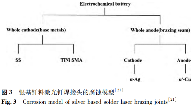 Li等選用銀基合金作為填充金屬,獲得激光釬焊NiTi/SS接頭,探究了兩種母材、填充金屬以及焊接接頭在不同pH值的人工唾液中的腐蝕行為。他們發(fā)現(xiàn)接頭的腐蝕主要發(fā)生在釬焊縫以及填充金屬與兩種母材的界面處,這是因?yàn)殁F焊縫的電極電位低于鎳鈦合金與不銹鋼,在人工唾液中成為原電池的陽(yáng)極首先被腐蝕(見(jiàn)圖3)。接頭的耐腐蝕性與鎳鈦合金母材相近,優(yōu)于填充金屬,但低于不銹鋼母材。另一方面,人工唾液的pH值會(huì)對(duì)材料的耐腐蝕性造成影響,pH值越高,材料的腐蝕電位越高,電流密度越低,耐腐蝕性越好。