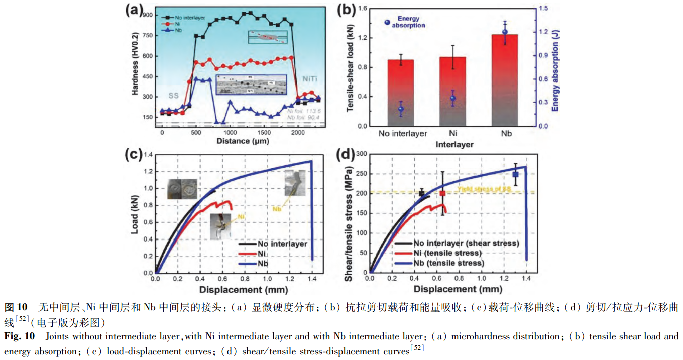通過(guò)替換有害相和限制混合這兩種方法可以控制焊接接頭中的金屬間化合物。為此,Zhang等選擇了低熔點(diǎn)Ni和高熔點(diǎn)Nb作為中間層。在Ni中間層接頭中,隨著脆性Fe2Ti相的替換,以Ni3Ti為主的焊縫具有更好的延展性。但鎳的蒸發(fā)會(huì)導(dǎo)致大氣孔、縮孔、裂紋的產(chǎn)生,使有效連接面積減小,造成接頭強(qiáng)度降低。在Nb中間層接頭中,熔合區(qū)被未熔融的Nb分離,這抑制了不同熔融金屬間的混合,并在界面處形成低脆性的含鈮共晶結(jié)構(gòu)。該接頭強(qiáng)度在斷裂載荷方面提高了38%,在能量吸收方面顯著提高了460%,如圖10所示。由此可知,高熔點(diǎn)中間層具有實(shí)現(xiàn)可靠NiTi/SS電阻點(diǎn)焊接頭的巨大潛力。