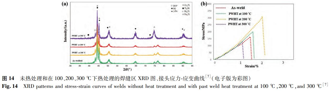 Asadi等研究了焊后退火溫度對(duì)激光焊接NiTi/SS接頭的影響。SEM結(jié)果顯示,經(jīng)過(guò)100℃和200℃的退火后,接頭的顯微組織沒(méi)有明顯變化。而在300℃退火的接頭中觀察到較大的枝晶結(jié)構(gòu)。相組成方面,相較于無(wú)焊后退火處理的接頭,100℃和200℃的退火處理對(duì)物相無(wú)明顯影響,但300℃的熱處理會(huì)導(dǎo)致金屬間化合物增加(見(jiàn)圖14a)。因此,焊接接頭的硬度和拉伸性能均隨退火溫度的升高而改善,但退火溫度達(dá)到300℃時(shí)力學(xué)性能惡化。如圖14b所示,200℃接頭具有最高的抗拉強(qiáng)度,其值高達(dá)310MPa,是未熱處理接頭抗拉強(qiáng)度的1.91倍。而300℃接頭的抗拉強(qiáng)度僅為129MPa,低于未熱處理接頭。類(lèi)似的研究也呈現(xiàn)出相同的結(jié)果,經(jīng)過(guò)200℃焊后熱處理的樣品的抗拉強(qiáng)度由213MPa提高到393MPa,耐腐蝕性能也得到提高。