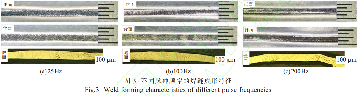 100μm厚TC4鈦合金超薄板P-MPAW在占空比30%、基值電流0.8A時(shí),不同脈沖頻率的焊縫成形特征如圖3所示。結(jié)果表明,P-MPAW實(shí)現(xiàn)了不同脈沖參數(shù)下100μm厚TC4鈦合金超薄板的單面焊雙面成形工藝,而且焊縫成形一致性良好。當(dāng)脈沖頻率為25Hz時(shí),焊縫呈現(xiàn)為魚(yú)鱗狀,且均勻連續(xù)未出現(xiàn)氣孔、裂紋等焊接缺陷;當(dāng)脈沖頻率分別為100、200Hz時(shí),焊縫均呈現(xiàn)為光滑連續(xù)焊縫。當(dāng)脈沖頻率增大時(shí)在微束等離子弧的高頻壓縮特性的作用下,使得焊縫變窄,因此脈沖頻率為200Hz時(shí)焊縫正面與背面寬度相較于脈沖頻率為25、100Hz時(shí)的更窄,焊縫截面寬度也更小。