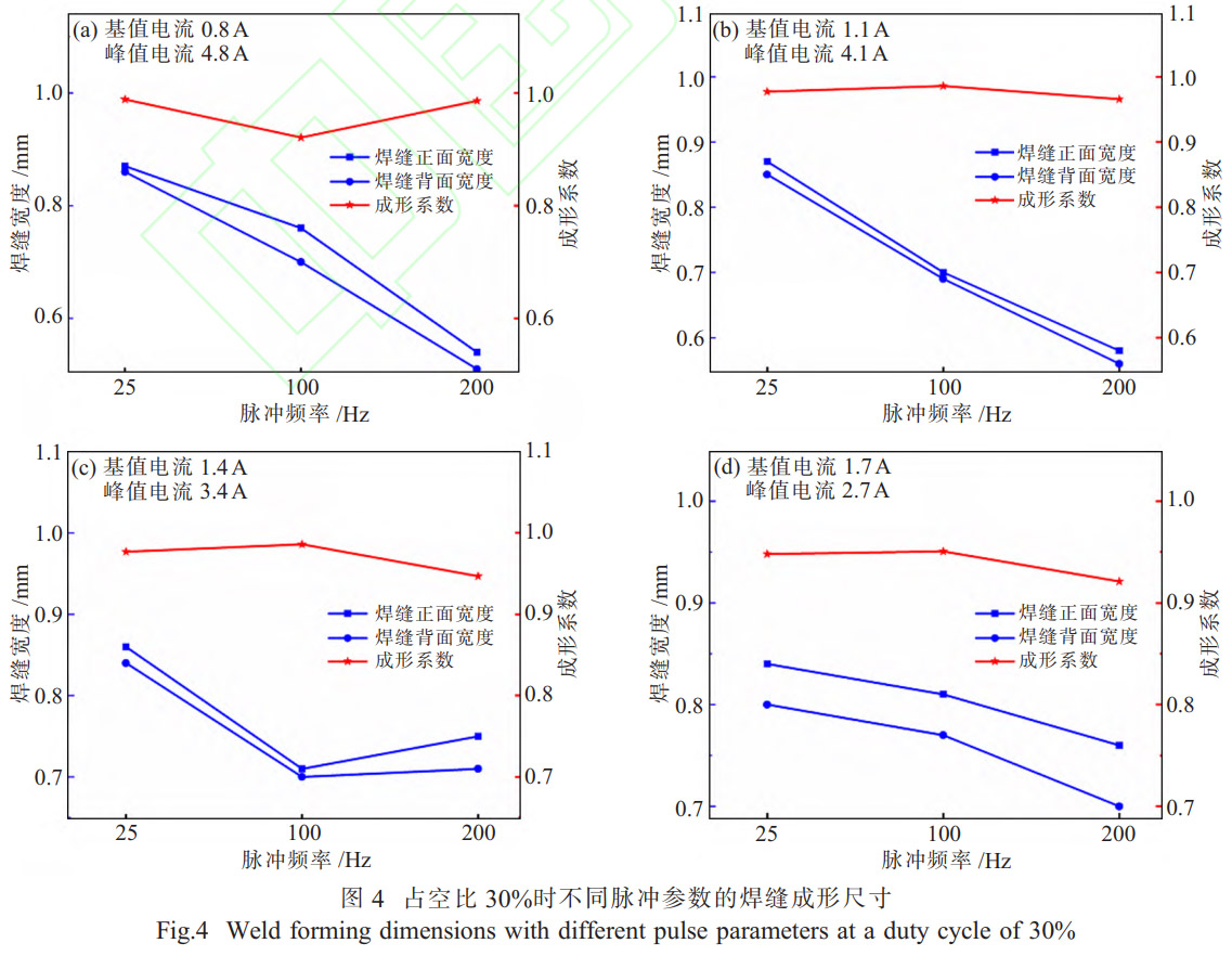 圖4為占空比30%時(shí)不同脈沖參數(shù)的焊縫成形尺寸。結(jié)果表明,在平均電流固定為2A、占空比30%時(shí),不同脈沖參數(shù)下,焊縫正面寬度大于焊縫背面寬度,焊縫成形系數(shù)趨近,焊縫成形穩(wěn)定;隨著基值電流的增大,焊縫寬度逐步變小,但變化趨勢(shì)有所減小;隨著脈沖頻率的增大,焊縫寬度逐步變小。其原因是當(dāng)平均電流、占空比和基值電流保持不變的情況下,當(dāng)脈沖頻率增大時(shí),在微束離子弧焊的高頻壓縮特性作用下,等離子束變細(xì)從而使得焊縫寬度變窄。