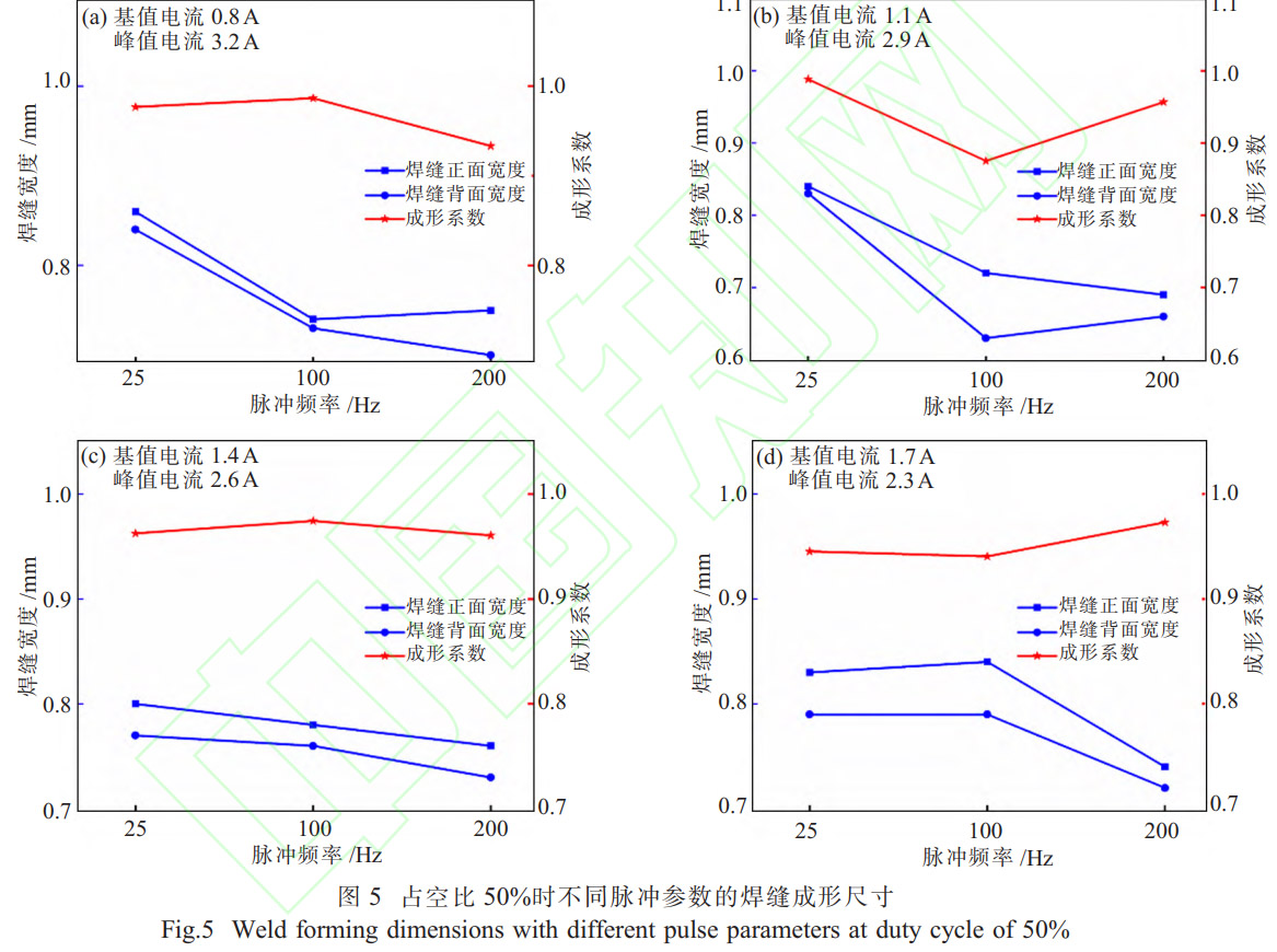 圖5為占空比50%時(shí)不同脈沖參數(shù)的焊縫成形尺寸。結(jié)果表明,在平均電流固定不變?yōu)?A、占空比50%時(shí),不同脈沖參數(shù)下,焊縫正面寬度大于焊縫背面寬度,焊縫成形系數(shù)趨近,焊縫成形穩(wěn)定;隨著基值電流的增大,焊縫寬度逐步變小;隨著脈沖頻率的增大,焊縫寬度逐步變小。在平均電流相同、占空比不變的情況下,占空比為30%時(shí)的焊縫寬度大于占空比為50%時(shí)的焊縫寬度,其原因是當(dāng)平均電流、占空比、基值電流、脈沖頻率不變的情況下,占空比30%時(shí)的峰值電流大于占空比50%時(shí)的峰值電流,峰值電流越大,電弧能量集中,電弧力越大,熔深和熔寬增加,因此焊縫寬度增大。