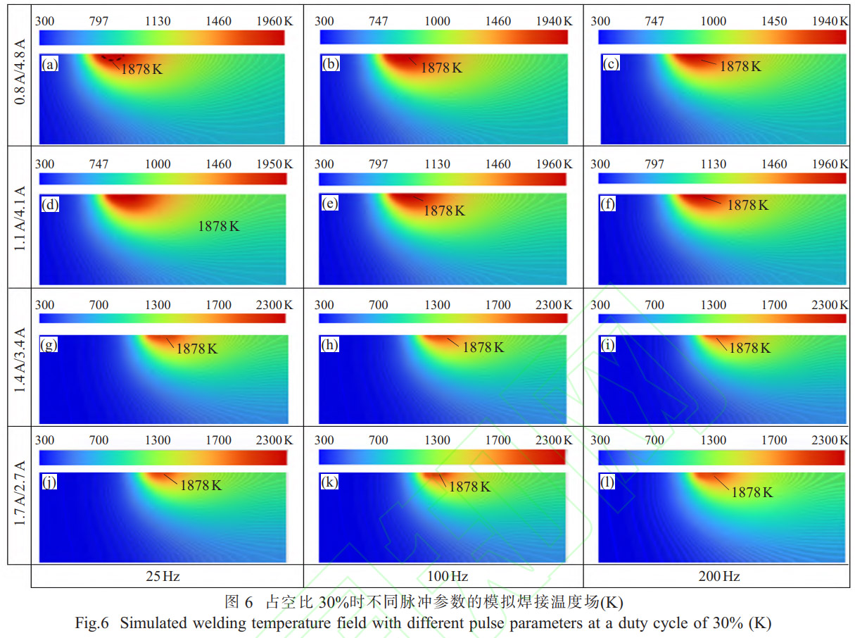 圖6為占空比30%時(shí)不同脈沖參數(shù)的模擬焊接溫度場(chǎng)。圖6(a)~(c)分別為占空比30%、基值電流0.8A不變時(shí),脈沖頻率分別為25、100、200Hz時(shí)的模擬焊接溫度場(chǎng),圖6(a)、(d)、(g)、(j)分別為占空比30%、脈沖頻率25Hz不變時(shí),基值電流對(duì)應(yīng)為0.8、1.1、1.4和1.7A時(shí)的模擬焊接溫度場(chǎng)。結(jié)果表明,當(dāng)占空比和基值電流保持不變的情況下,隨著脈沖頻率的增大,高于TC4鈦合金熔點(diǎn)(1878K)的溫度場(chǎng)面積有所減小;當(dāng)占空比和脈沖頻率保持不變的情況下,隨著基值電流的增大,高于TC4鈦合金熔點(diǎn)的溫度場(chǎng)面積亦有所減小。在模擬整個(gè)焊接過(guò)程中發(fā)現(xiàn),焊接溫度場(chǎng)從穩(wěn)態(tài)到非穩(wěn)態(tài)再過(guò)渡到穩(wěn)態(tài),模擬焊接溫度場(chǎng)熱源附近溫度最高,遠(yuǎn)離熱源,溫度逐漸降低,熱源正前方等溫線密集。說(shuō)明該區(qū)域溫度梯度較大,熱源后方形成有彗尾狀溫度場(chǎng),溫度梯度較小,因此等溫線較為分散。