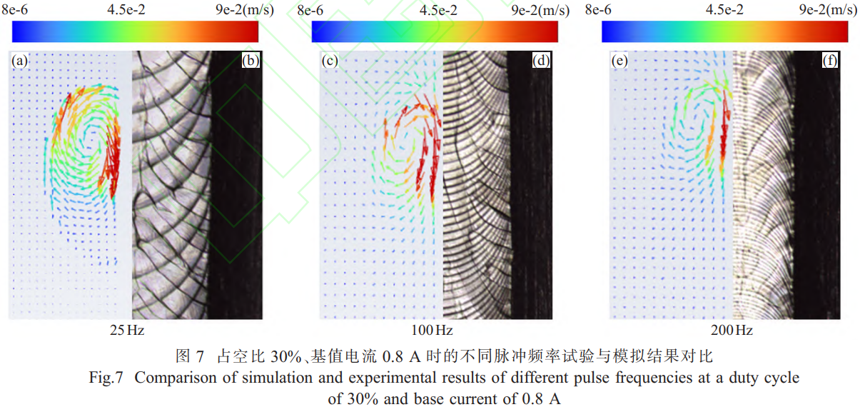 圖7為占空比30%、基值電流0.8A時(shí)的不同脈沖頻率試驗(yàn)與模擬結(jié)果對(duì)比。。其中圖7(a)、(c)、(e)分別為脈沖頻率為25、100、200Hz時(shí)數(shù)值模擬焊接熔池流場(chǎng);圖7(b)、(d)、(f)分別為脈沖頻率為25、100、200Hz時(shí),共聚焦顯微鏡觀察到的焊縫形貌。結(jié)果表明,熔池流場(chǎng)整體呈橢圓形,在基值電流和脈沖電流的交替作用下,對(duì)熔池形成了一定攪拌作用,使焊縫液態(tài)金屬順時(shí)針流動(dòng)。其中,熱源中心位置流速最大,結(jié)合溫度場(chǎng)分析,熔池前方溫度梯度大,金屬未熔化,熔池較窄,液態(tài)金屬流動(dòng)受阻使得流速較大。熔池后方溫度梯度小,液態(tài)金屬處于冷卻凝固過(guò)程,熔池較寬,液態(tài)金屬堆積導(dǎo)致流速較慢,因此流場(chǎng)整體呈橢圓形。對(duì)比圖7(a)、(c)、(e)可以明顯看出,模擬熔池輪廓與試驗(yàn)所得到的焊縫形貌基本吻合。隨著脈沖頻率的增大,模擬熔池流場(chǎng)范圍變小,焊縫寬度也隨之減小,與工藝試驗(yàn)結(jié)果一致。隨著脈沖頻率的增大,液體金屬流速變小,逐漸趨于平穩(wěn),有利于焊縫成形,焊縫從魚(yú)鱗焊縫逐漸過(guò)渡至連續(xù)焊縫。