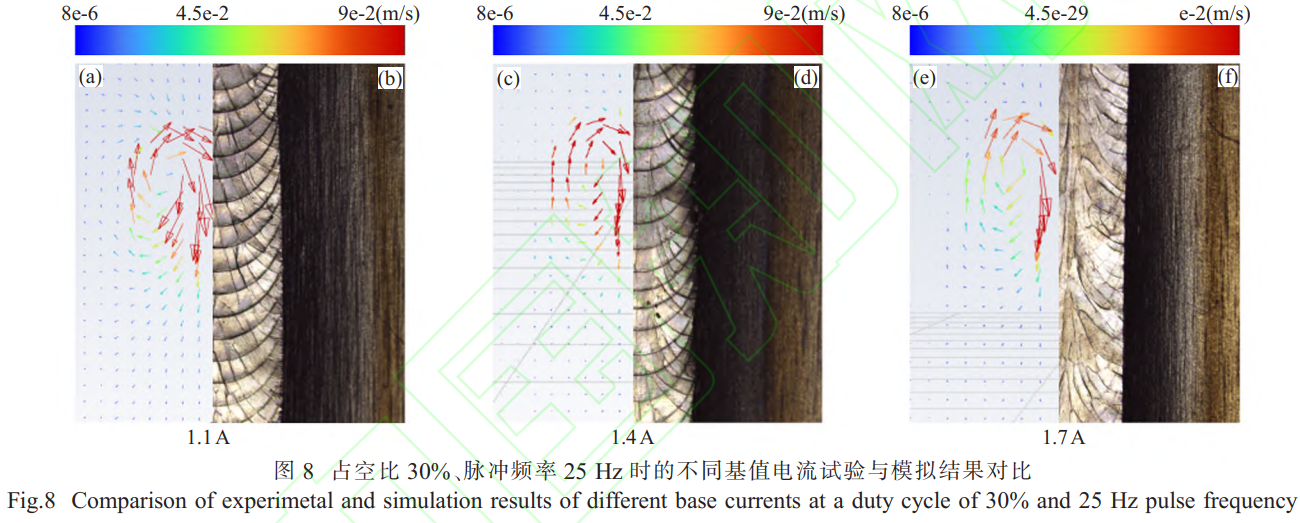 圖8為占空比30%、脈沖頻率25Hz時(shí)的不同基值電流試驗(yàn)與模擬結(jié)果對(duì)比。圖8(a)、(c)、(e)分別為基值電流1.1、1.4、1.7A時(shí)數(shù)值模擬焊接熔池流場(chǎng);圖8(b)、(d)、(f)分別為基值電流1.1、1.4、1.7A時(shí),共聚焦顯微鏡觀察到的焊縫形貌。對(duì)比圖8(b)、(d)、(f)可以明顯看出,模擬熔池輪廓與試驗(yàn)所得到的焊縫形貌基本吻合,隨著基值電流的增大,模擬熔池流場(chǎng)范圍變小,焊縫寬度也隨之減小,與工藝試驗(yàn)結(jié)果一致。隨著基值電流的增大,峰值電流與基值電流差值變小,液體金屬流速變小,逐漸趨于平穩(wěn)。