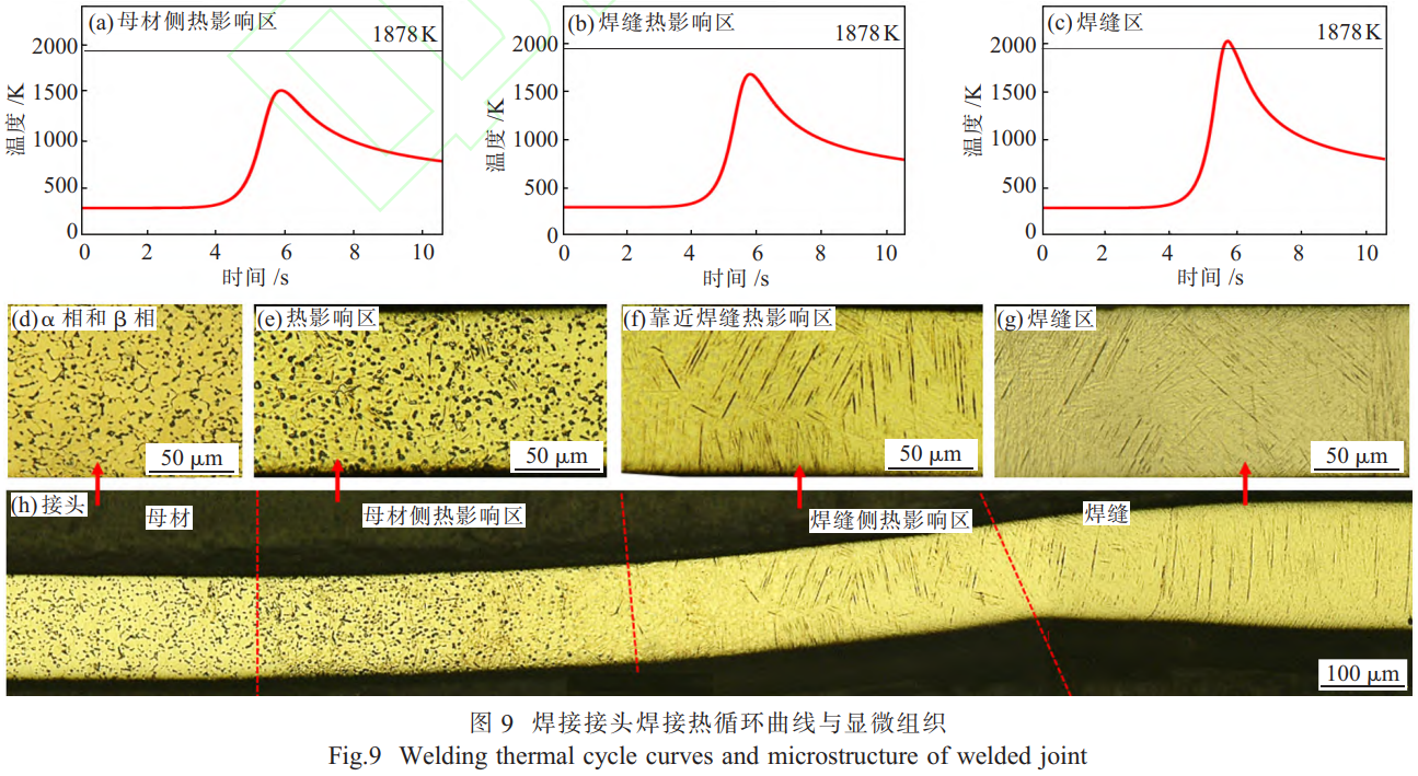 占空比30%、基值電流0.8A、脈沖頻率分別為25Hz時(shí),焊接接頭焊接熱循環(huán)曲線與顯微組織如圖9所示。其中,圖9(h)為典型的100μm厚TC4鈦合金超薄板P-MPAW的焊接接頭顯微組織。由圖9(d)可見(jiàn),TC4鈦合金為等軸的α相和β相雙相鈦合金。由圖9(g)可見(jiàn),焊縫區(qū)的微觀組織主要表現(xiàn)為網(wǎng)籃組織,這是由于焊接過(guò)程中在脈沖電流的作用下,焊縫金屬迅速達(dá)到相變溫度,原生 α相和β相向高溫β相轉(zhuǎn)變,高溫β相通過(guò)晶格重構(gòu)轉(zhuǎn)變?yōu)?α ′馬氏體相 [10],生成的大量 α ′馬氏體相互相交織在一起形成網(wǎng)籃組織。由圖9(e)、(f)可知,熱影響區(qū)的微觀組織主要表現(xiàn)為等軸 α相和β相以及針狀 α ′相馬氏體多相共存現(xiàn)象。在圖9(b)、(f)中,熱影響區(qū)由于靠近焊縫,在焊縫高溫影響下原生 α相和β相向高溫β相轉(zhuǎn)變,但由于冷卻速度快,冷卻后部分α相和高溫β相轉(zhuǎn)變?yōu)?alpha;'馬氏體,因此在圖9(f)中可以明顯看出熱影響區(qū)內(nèi)存在部分針狀α'馬氏體,在圖9(a)、(e)中熱影響區(qū)由于靠近母材,焊縫溫度相較于焊縫側(cè)熱影響區(qū)有所降低,從而顯微組織亦有所不同,顯微組織表現(xiàn)為部分α相、高溫β相以及針狀馬氏體多相共存。