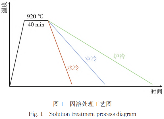將切割出來的試樣放入SG-GL1200管式爐中,加熱到920℃,然后保溫40min,再對其用空冷、爐冷、水冷三種不同的冷卻方式進行冷卻。固溶處理工藝流程如圖1所示。