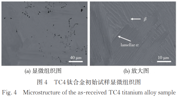 圖4為初始狀態未經處理的TC4鈦合金的顯微組織圖及其放大圖。可以看出,初始狀態的TC4鈦合金由兩種相(α相和β相)組成。顏色較深且呈現為片層狀的相為α相,在晶粒中縱橫交錯排列形成網籃組織;顏色較淺,呈白色的為殘余β相。