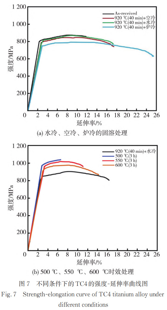 圖7為不同冷卻方式固溶、920℃(40min)水冷和不同溫度時效處理后的TC4的強度-延伸率曲線圖。