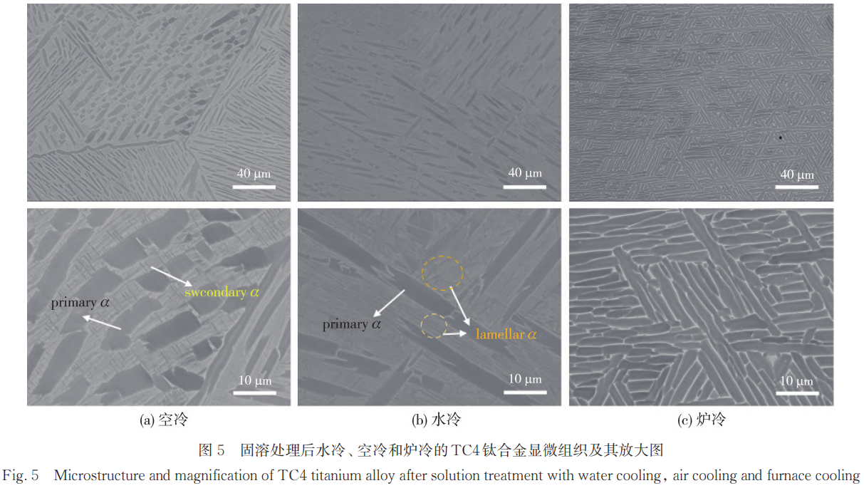 對TC4鈦合金試樣進行固溶處理,水冷、空冷和爐冷后的顯微組織及其局部放大圖如圖5所示。圖5(a)中等軸狀的初生α相(αp )和針狀的次生α相(a)均勻分布在β基體中。在水冷過程中組織為穩定相,形態和大小基本不發生變化;由于水冷的冷卻速度極快,抑制了β相中合金元素的擴散,αs通過無擴散的切變機制由β相轉變為過飽和的六方馬氏體,組織為等軸αp+針狀αs 。空冷后的組織與水冷類似,αp 都均勻分散在 β基體中,如圖5(b)所示。由于冷卻速度較慢可以為β相的分解提供有限的時間和驅動力,片層α首先在晶界處析出,然后在β晶粒內部以特定的晶體學位向關系成核并長大,形成如圖5(b)中下圖所示的集束狀或片層狀,組織為等軸αp 十片層α,即典型的“雙態組織”。爐冷后的組織與前兩者明顯不同,如圖5(c),只能觀察到球化的αp和粗大的片層α。由于爐冷的速度非常慢, β相有充分的時間進行擴散型相變,形成粗大、清晰可見的片層 α,這些片層 α與殘余的 β相交替排列,形成類似“籃網”狀的結構;同時慢冷也使得αp 的比例更高,αp 在緩慢冷卻過程中,會發生輕微的長大或球化,組織為等軸αp +粗大片層 α,更接近平衡狀態 [16]。