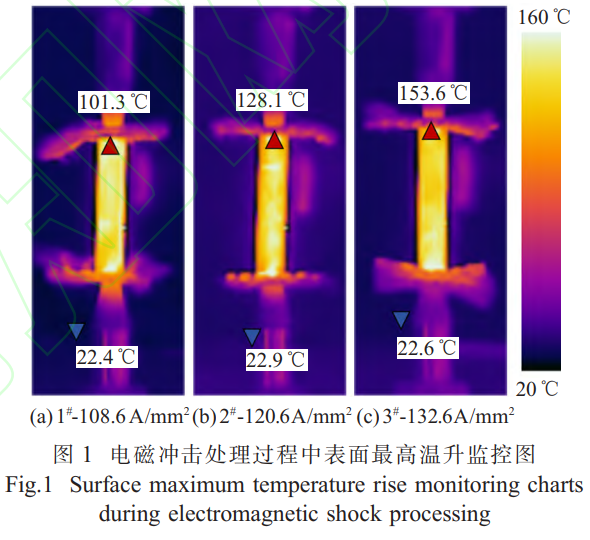 采用實驗室自制的脈沖電流發(fā)生裝置進行電磁沖擊處理,共設計4組試樣(0#、1#、2#、3#),0#為未處理試樣,其余3組(1#、2#、3#)進行電磁沖擊處理,處理時間均為0.06s,峰值電流密度頻率為50Hz,峰值電流密度分別為108.6、120.6、132.6A/mm2。為了監(jiān)測電磁沖擊處理期間試樣表面溫度變化,使用Fotric-226紅外熱像儀對試樣表面溫度進行實時監(jiān)控,電磁沖擊處理期間試樣表面最高溫度如圖1所示。隨著峰值電流密度逐步升高,試樣表面最大溫升也逐漸升高,試樣最高溫度總體小于160℃,室溫為23℃左右。