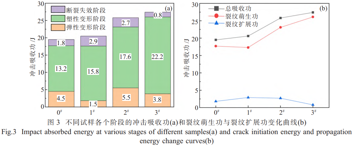 沖擊變形的三個階段分別吸收的能量占比如圖3所示。結(jié)果表明,裂紋萌生功占整個沖擊變形過程的主體部分,而裂紋擴展功的大小關(guān)系到材料的損傷容限能力,提高裂紋擴展功對于材料的沖擊韌性提高也至關(guān)重要,是材料增韌的重要手段之一。同時,經(jīng)過電磁沖擊處理之后,隨著峰值電流密度的提高,總沖擊吸收功逐漸提高,其中3#試樣的沖擊吸收功最高(26.8J),與0號試樣沖擊功(19.5J)相比,提高了37.4%。然而,3#試樣的裂紋擴展功相比0#試樣大幅下降,同時在彈性變形階段吸收的能量也略有降低,其沖擊韌性的提高主要歸因于裂紋萌生功的大幅提升;雖然2#試樣沖擊功略低于3#試樣,但其沖擊變形的三個階段吸收能量相比處理前均有所提升;1#試樣的增韌效果最不明顯,主要體現(xiàn)在沖擊變形的第一階段(彈性變形階段),吸收功降低了66%,雖然其他階段吸收功的提升彌補了這一點,但總體增韌效果最差。綜上,隨著電磁沖擊處理峰值電流密度的提高,抗裂紋萌生能力表現(xiàn)出逐漸升高的趨勢,而抗裂紋擴展能力表現(xiàn)出先升高后降低的趨勢,如圖3(b)所示。