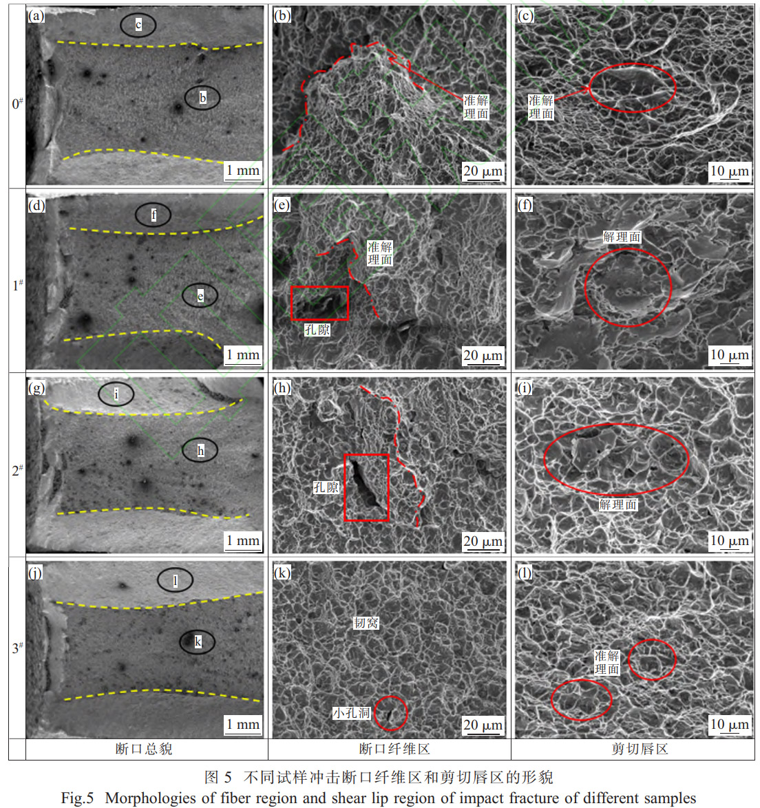 (未處理試樣),其纖維區(qū)能觀察到明顯的準解理面,表面不平整,準解理面上分布細淺的韌窩,剪切唇區(qū)也能觀察到準解理斷裂的不規(guī)則表面;經(jīng)電磁處理之后,1#試樣纖維區(qū)也分布著明顯的準解理面,且存在較大面積的孔隙,孔隙旁分布著沒有韌窩的不規(guī)則平整表面,這表明其試樣沖擊斷裂過程中發(fā)生明顯的沿晶斷裂,而在剪切唇區(qū)能看到分布密集的云朵形狀表面,這可能是發(fā)生沿晶斷裂的等軸 α相晶界,這與圖3中1#試樣裂紋萌生功最低這一結(jié)果相吻合;2#試樣的纖維區(qū)表面呈現(xiàn)較不明顯的不規(guī)則多邊形狀突起,有較小的孔洞和較大的裂紋,這些缺陷周圍密布細小的韌窩,表現(xiàn)出了較好的損傷容限能力;整體來看,3#試樣的纖維區(qū)寬度相對最窄,剪切唇區(qū)高聳,上下對稱寬而厚,表現(xiàn)出較好的塑性,纖維區(qū)的掃描形貌中,僅能觀察到較細小的孔洞,韌窩分布均勻密集,韌窩細而深,剪切唇區(qū)局部的準解理面也相對較小,這與圖3中3#試樣沖擊吸收功最高這一結(jié)果相吻合。