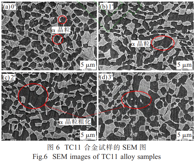 圖6為TC11合金試樣的SEM形貌圖。從圖中可以看出,TC11合金的微觀結(jié)構(gòu)是由αp和 β t 組成的兩相結(jié)構(gòu)。結(jié)果表明,經(jīng)過電磁沖擊處理之后,試樣內(nèi)αp晶粒尺寸發(fā)生了變化,一些相鄰的等軸 α晶粒似乎連接在了一起,平均晶粒直徑有所增加。為了更直觀地考察試樣相組成與分布發(fā)生的變化,采用imageproplus軟件對不同試樣的相組成與晶粒粒徑進行統(tǒng)計分析,結(jié)果如表1所示。根據(jù)分析結(jié)果可知,與未處理試樣相比,電磁沖擊處理后試樣αp相面積分數(shù)略微有所波動,但αp相晶粒平均直徑相比于未處理的0#試樣有明顯增加,且隨著電磁沖擊處理峰值電流密度的增加而增加,即處理后的試樣αp晶粒發(fā)生了較為明顯的晶粒粗化。