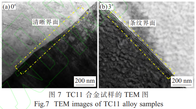 進一步,取0#試樣和3#試樣進行TEM觀察,結(jié)果如圖7所示。經(jīng)過電磁沖擊處理之后,TC11鈦合金的界面處發(fā)生了明顯的變化,未處理的0#試樣中觀察到的界面普遍清晰分明。但在電磁沖擊處理后的3試樣中頻繁觀察到界面在寬度上明顯有所增加,從形態(tài)上看,其在納米尺度上出現(xiàn)了條紋狀界面。