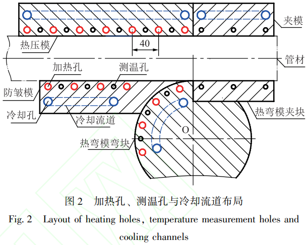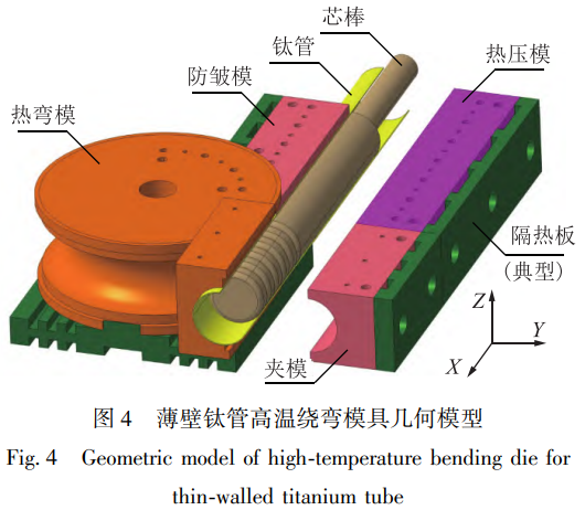 (2)模具加熱系統采用內置式電熱管加熱,配置“加熱-測溫-反饋”閉環控制功能的溫度控制儀,可實現模具精準加溫、測溫和恒溫;在模具與彎管機工作臺之間設置氧化鋁陶瓷隔熱板,能實現模具與彎管機的高效隔熱;冷卻系統采用內置式流道水冷方式,配置自動溫控水箱,能快速降低模具溫度;高溫主受力模具材料選用高速鋼、高溫次受力模具材料選用熱作模具鋼,以滿足鈦管高溫工況下的高溫承載需求。