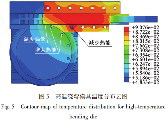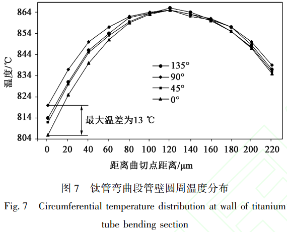 (3)有限元數值模擬可有效預測模具溫度分布狀態,驗證模具溫度能否滿足鈦管成形要求,大幅減少物理實驗的迭代次數。通過測試表明,模具溫度分布滿足薄壁鈦管高溫繞彎工藝要求,鈦管彎曲段管壁圓周的溫度均勻性控制在要求范圍內。