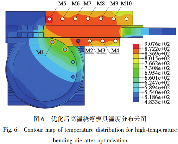 鈦管高溫繞彎時,鈦管彎曲段管壁圓周都被模具夾持,無法直接測量管壁溫度,只能間接測量模具溫度,從數值模擬結果中提取10個熱電偶(M1~M10)安裝位置的溫度數據,為鈦管高溫繞彎模具實驗測試提供理論數據。熱電偶(M1~M10)分布位置見圖6,其中熱彎模上安裝1個熱電偶、熱壓模上安裝6個熱電偶、防皺模上安裝3個熱電偶。