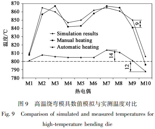 (2)自動加熱情況下,除熱電偶(M10)外,其余熱電偶(M1~M9)的實測溫度在801~814℃之間,滿足薄壁鈦管高溫繞彎溫度要求(800℃),說明溫度控制儀的自動恒溫作用明顯,能精確動態調控模具的實際溫度;