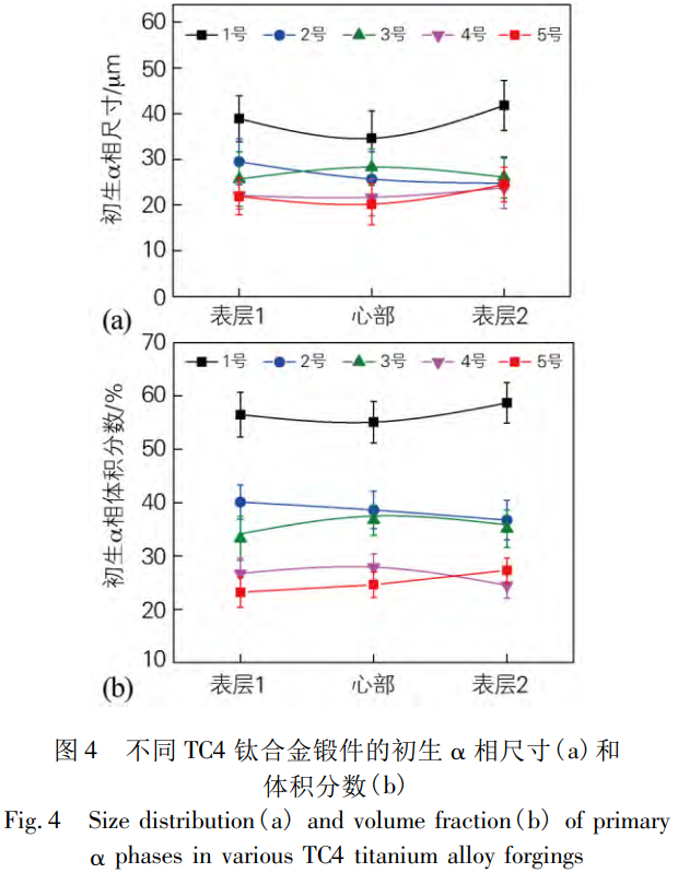 通過對2號及3號鈦合金鍛件進行顯微組織觀察,結果如圖 3所示,可以看到 2號及 3號鈦合金鍛件表層區域及心部區域初生α相的尺寸的均勻性極差。尤其是3號鈦合金鍛件的表層1及心部區域,這可能是造成其力學性能較低的一個重要原因。進一步從2號及3號鈦合金鍛件不同區域的組織可以看出,初生α相的尺寸與體積分數相比于1號鈦合金鍛件組織有所降低。圖4列出了TC4鈦合金鍛件在不同退火溫度下的初生α相尺寸分布及體積分數的變化。從圖4可以看出,經過910℃高溫退火后,2號鈦合金鍛件表層 1、心部和表層 2的初生α相平均尺寸為 29.5、25.7和24.8μm,平均體積分數分別為40.1%、38.6%和36.7%。3號鈦合金鍛件表層1、心部和表層2的初生α相平均尺寸為 25.7、28.3和 26.1μm,平均體積分數分別為33.3%、36.7%和35.1%。與1號鈦合金鍛件相比,不同區域初生α相尺寸降低了 10~15μm,平均體積分數下降了15%~22%。當退火溫度較高時,初生α相會發生相變,轉變為β相。溫度越接近相變點,相變驅動力越高,轉變比例就越大。此外,從圖3[a,d]可以看出,初生α相“凹槽”和“波浪”現象消失,這說明退火溫度提升至910和920℃保溫時,靜態球化過程進一步進行,但是大量的初生α相為不規則的等軸狀,這可能是由于在保溫過程中靜態球化過程不充分,使得沒有完全球化的初生α相局部轉變為β相,造成邊緣有類似“飛邊”、“尖刺”等不規則形狀出現,這可能也是導致組織均勻性較差的原因。