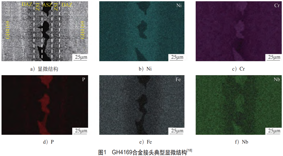 對于葉片的修復與制造,目前主要采用熔焊與釬焊等焊接技術[16,17]。朱凱濤等[18]采用BNi-7箔帶釬料實現了GH4169合金的釬焊連接,其接頭典型顯微組織及元素分布如圖1所示。