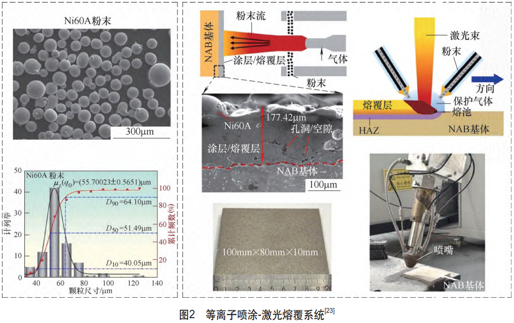 近年來,激光制造技術的快速發展在鎳基高溫合金渦輪葉片的高可靠制造中展現出廣闊的應用前景,成為當前研究的熱點方向[22]。LIU等[23]首先通過等離子噴涂沉積在NAB基板上,隨后激光熔覆Ni60A粉末形成復合涂層,制備系統如圖2所示,系統性地研究了涂層的微觀結構、顯微硬度和耐蝕性。結果表明,激光包覆涂層中的增強相主要由Ni3B,M7C3,Cr5B3及M23C6組成。激光涂層的頂層區域呈細小的等軸樹突或顆粒狀。