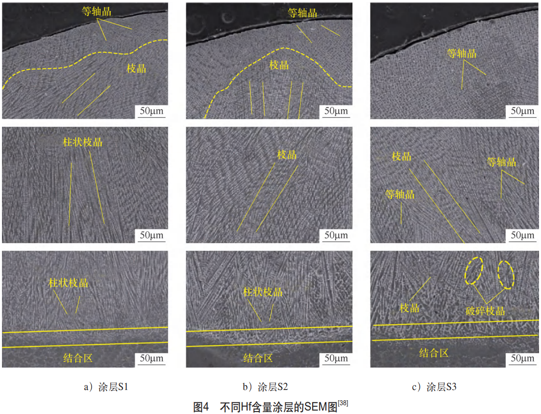 (1)超聲波振動輔助激光制造超聲波振動通過聲流效應和空化效應影響熔池動態行為,輔助激光制造是一種結合超聲波能量與激光技術的復合加工方法,近年來在高端裝備修復、材料性能優化等領域展現出顯著潛力[37]。嵇春艷等[38]研究了超聲波振動輔助激光熔覆工藝在Inconel718合金表面制備Inconel 718-Hf涂層的微觀結構演變及氧化行為,涂層SEM圖像如圖4所示。