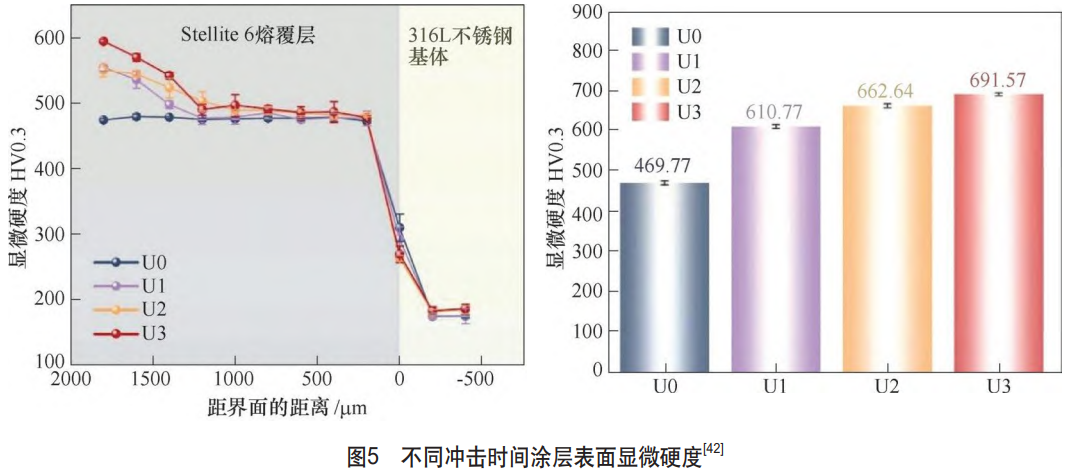 ZOHOURMESGAR等[39]研究了超聲波振動對激光直接能量沉積(LDED)Inconel718合金質量效率和微觀結構的影響,揭示超聲波振動對晶粒形態及Laves相的影響。L\dot{U}等[40]研究了超聲波振動對LDED制備Hastelloy X高溫合金微觀結構及高溫氧化和變形行為的影響,深度表征了超聲波振動對合金材料變形行為的影響機制。FAN等研究了二維超聲波振動對增材制造Inconel718合金顯微組織和力學性能的影響。結果表明,兩種二維超聲波振動策略均能使抗拉強度>910MPa,同時實現了強度與延展性的平衡。LIU等[42]研究了涂層在不同超聲波沖擊(UIT)持續時間下的微觀結構特性和力學性能。結果表明,UIT促使涂層表面缺陷減少,孔隙率較原始涂層顯著降低了90%。同時,涂層表面顯微硬度達到691.57HV0.3,如圖5所示,較原始涂層增加了約47.21%。