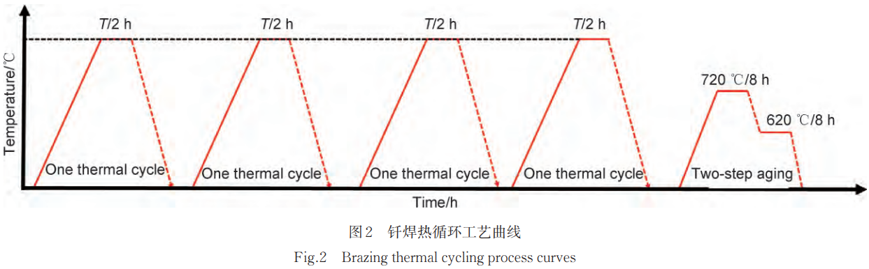 為研究釬焊峰值溫度的影響,在970~1040℃釬焊熱循環區間內設置不同溫度。試件從室溫以10℃/min升至峰值溫度,保溫2h后隨爐冷卻至300℃,完成4次循環后進行雙步時效處理(720℃保溫8h,以50℃/h速率冷卻至620℃,保溫8h后空冷),工藝曲線如圖2所示。