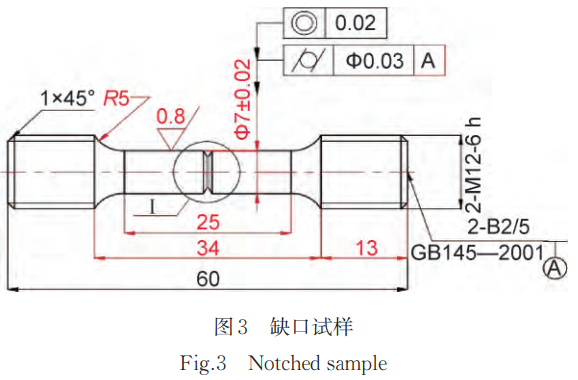 實驗用的持久試樣和缺口試樣均根據GB/T 2039—2024標準制備。持久滑軌試樣為圓柱形無缺口試樣,用以測試材料在高溫應力條件下的持久斷裂壽命;缺口試樣則在試樣中部加工一個標準的半圓形缺口,缺口如圖3所示,用以模擬材料在高溫應力下的缺口斷裂特性。
