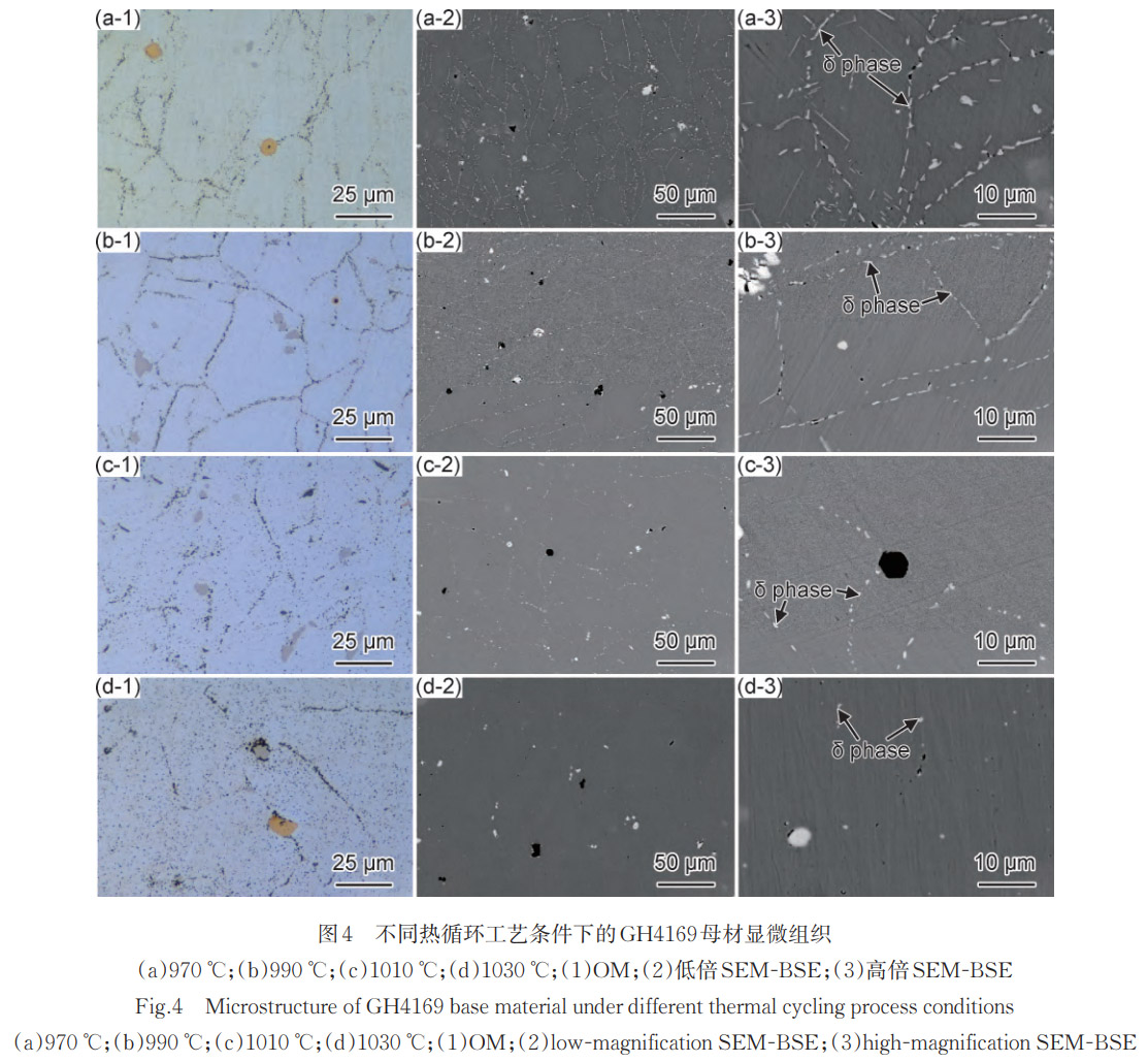 綜上所述,δ相的析出量隨多次熱循環峰值溫度的升高呈現逐漸降低的變化趨勢,形態由針狀→棒狀→顆粒狀轉變,在970℃時達到析出量峰值。這一析出行為的演變規律表明:δ相的析出對晶界穩定性和基體Nb濃度的調控具有重要作用,同時對GH4169合金的力學性能產生重要影響。