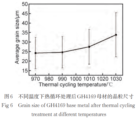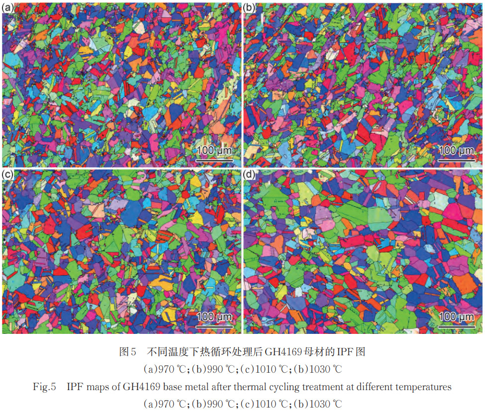 為確定不同熱循環下GH4169母材在晶粒尺寸上的差異性,采用EBSD表征其IPF圖如圖5所示,并對平均晶粒尺寸進行統計,結果如圖6所示。由圖5和圖6可知在970~1010℃峰值溫度內熱循環處理時,晶粒尺寸未發生顯著變化,這主要有兩個原因,一是由于在這個溫度范圍內,合金中的原子擴散速率相對較低,這可能導致晶粒生長速率較低。二是由于晶界處的δ相具有釘扎晶界的作用,大量細小的針狀δ相在晶界處析出,提高晶粒的穩定性。