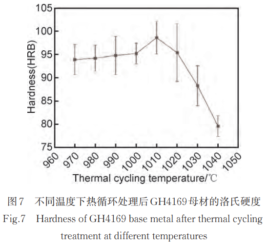 對不同溫度熱循環下的GH4169合金進行洛氏硬度測試,結果如圖7所示。可知在970~1010℃范圍內,GH4169合金的硬度隨熱循環溫度提高而增加,在1010℃達到峰值,這是由于較低熱循環溫度(970~980℃)時,針狀δ相在晶界大量析出,部分Nb元素被δ相所消耗,使得基體中可用于析出強化相(γ″、γ′)的Nb、Ti含量相對不足,γ″、γ′在時效階段的析出相對較少,因此具有較低的硬度;而當熱循環溫度在990~1010℃之間時,部分針狀δ相溶解,釋放出更多Nb、Ti溶入基體,促進γ″、γ′強化相在兩步時效中的析出,從而使硬度明顯提高;之后隨著熱循環溫度繼續增加,硬度顯著降低,這是由于雖然δ相幾乎完全溶解,γ″、γ′強化相最大程度地析出,但同時晶粒顯著長大,使合金的“細晶強化”作用降低,導致GH4169合金的硬度顯著降低。