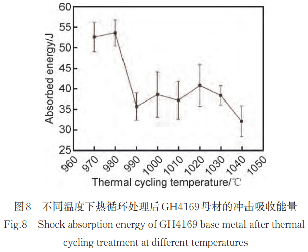 對不同溫度熱循環下的GH4169合金進行室溫沖擊韌性測試,結果如圖8所示。由圖可知,在970~990℃溫度范圍內,GH4169合金的硬度隨熱循環溫度提高而降低,這是由于δ相形態由針狀向棒狀轉變,導致更多微孔形核源,并且在棒狀δ相周圍會形成貧γ″相析出區,沿晶δ相析出會形成無強化相析出帶,從而成為裂紋的擴展路徑;隨著熱循環溫度繼續升高,在990~1010℃范圍內,δ相的大量溶解,使得無強化相析出帶消失,從而提高了合金的沖擊韌性;但隨著溫度繼續升高,晶粒尺寸增加,使得合金的沖擊韌性繼續降低。