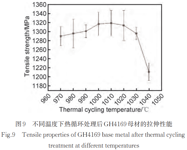 不同溫度下熱循環處理后GH4169母材的拉伸性能如圖9所示,由圖可見抗拉強度隨著熱循環溫度的升高先增加后降低,并在1010℃時達到峰值。這一現象主要歸因于釬焊熱循環溫度對合金強化相的析出行為和晶粒尺寸的綜合影響。在較低的熱循環溫度(970℃)下,δ相(Ni3Nb)在晶界處大量析出,起到釘扎晶界的作用,抑制了晶粒長大。然而,這也導致了基體中Nb等合金元素的固溶度不足,限制了在隨后的時效處理中γ″(Ni3Nb)和γ′(Ni3(Al,Ti))強化相的充分析出,因而強化效果有限。隨著熱循環溫度升高至1010℃,δ相逐漸溶解,更多的Nb和Ti元素固溶進入基體,在時效過程中能夠析出更多、更細小、分布更均勻的γ″和γ′相,這些強化相有效地阻礙了位錯運動,顯著提高了合金的抗拉強度。同時,在此溫度范圍內,晶粒尺寸尚未發生顯著增大,晶界強化作用仍然存在,進一步提升了材料的強度。然而,當釬焊熱循環溫度繼續升高至1030℃時,δ相完全溶解,雖然強化相的析出達到最大,但過高的釬焊熱循環溫度導致晶粒顯著長大,晶界面積減少,晶界強化作用下降。此外,晶粒粗化可能引起應力集中區域減少,位錯源減少,降低了材料的加工硬化能力和塑性,使抗拉強度反而下降。綜上所述,GH4169合金抗拉強度隨固溶溫度的變化是δ相溶解、強化相析出和晶粒尺寸三者相互作用的結果,在1010℃時達到最佳平衡,形成了最優的微觀組織,使得抗拉強度達到峰值。