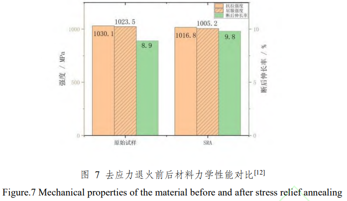 在退火溫度低于再結晶溫度時,由于微觀組織形貌變化不大,僅有少量a'相會發生輕微溶解。由于a'相是強化相,且去應力退火能夠有效較少位錯,減少晶體缺陷。因此,經過去應力退火的Ti-6Al-4V鈦合金相較于未退火狀態,強度會發生輕微的降低,硬度輕微上升。