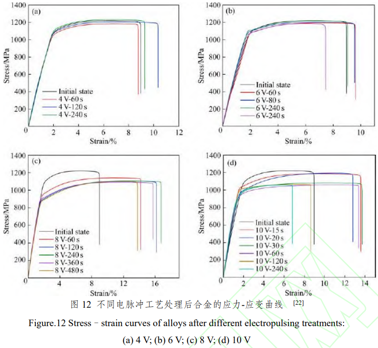 許尚峰[22]對 Ti-6Al-4V鈦合金進行電場輔助熱處理,發現電場輔助熱處理能有效降低材料的相變溫度和再結晶溫度,與傳統工藝相比,再結晶溫度下降100℃左右。在熱效應(焦爾效應)和非熱效應(電致遷移效應)共同作用下,相變過程與等軸化過程同步進行的同時,位錯的均勻分布和擴散也在發生,使得材料的延展性提升近一倍。
