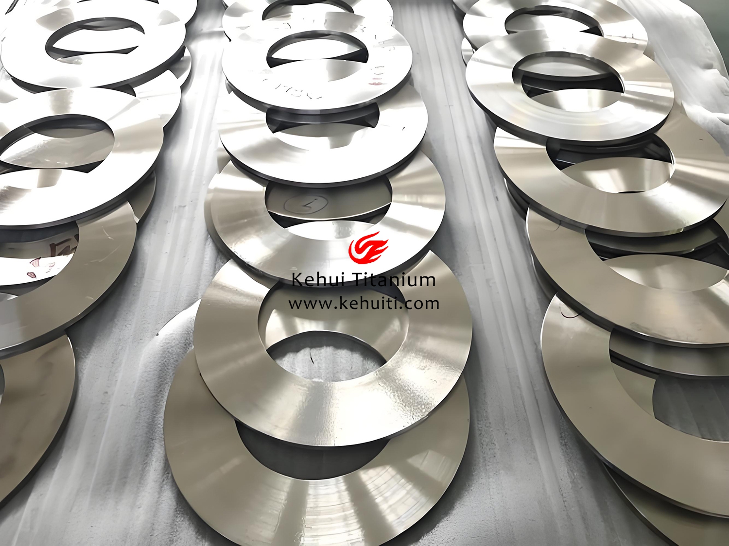 海水淡化設(shè)備用鈦環(huán)多采用 TA2、TA10 等工業(yè)純鈦或 Ti-0.3Mo-0.8Ni 等耐蝕鈦合金,具備優(yōu)異耐海水腐蝕能力(抗氯離子腐蝕且年腐蝕率<0.001mm)、抗生物附著性、耐沖刷性及良好導(dǎo)熱性,廣泛應(yīng)用于反滲透膜組件(膜殼密封環(huán)、連接件)、蒸餾裝置(熱交換管板、折流環(huán))、海水輸送管道(法蘭連接環(huán)、膨脹節(jié))、取排水設(shè)備(泵葉輪固定環(huán)、軸封環(huán))等場(chǎng)景,其制造采用冷成型加工(利用塑性冷沖壓或旋壓制造薄壁件)、氬氣保護(hù)焊接(焊后酸洗鈍化恢復(fù)耐蝕膜)、電解拋光(表面粗糙度 Ra≤0.8μm)及壓力測(cè)試(1.5 倍工作壓力保壓),相比 316L 不銹鋼使用壽命延長(zhǎng) 5-10 倍、維護(hù)成本低且輕量化,需注意電偶腐蝕隔離與加工防鐵離子污染,未來將向低成本耐蝕鈦合金及復(fù)合結(jié)構(gòu)方向發(fā)展。以下為科輝鈦業(yè)對(duì)海水淡化設(shè)備用鈦環(huán)的材質(zhì)、標(biāo)準(zhǔn)、性能特點(diǎn)、應(yīng)用等多維度概述。