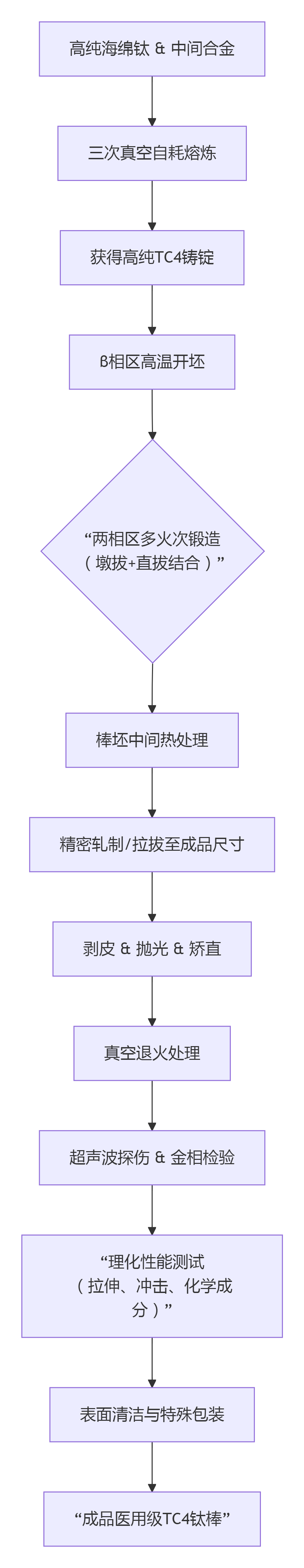 一個符合醫療級標準的TC4鈦棒典型加工流程如下圖所示,其核心在于多階段的塑性變形與精細控制: